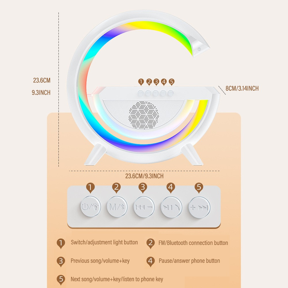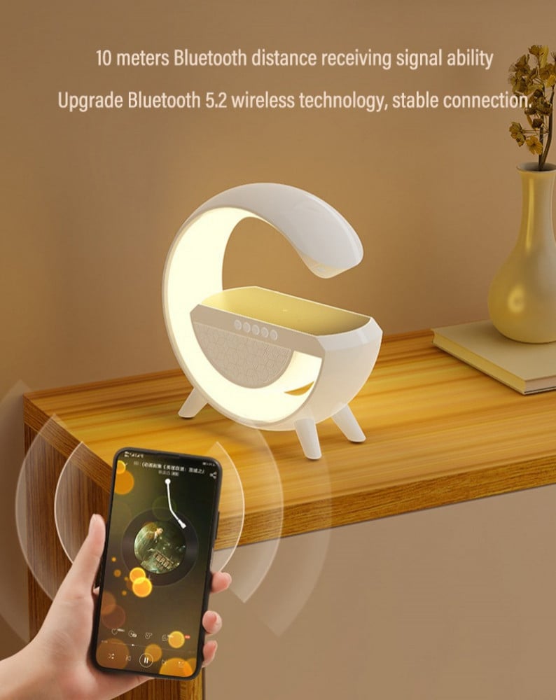مصباح طاولة متعدد الاستعمالات بتصميم عصري جذاب مما يجعلها إضافة جميلة، كما توفر سماعة سبيكر مدمجة تعمل بالبلوتوث بالإضافة إلى شحن لاسلكي.